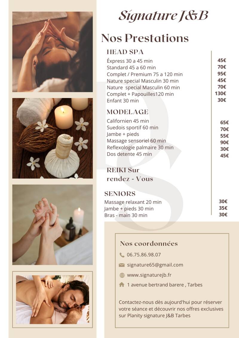Chez Signature J&B, nous vous proposons une gamme variée de massages pour répondre à tous vos besoins. Profitez des bienfaits du massage californien, du massage suédois ou laissez-vous tenter par un head spa indien. Chaque massage est personnalisé pour vous offrir une expérience unique et des bienfaits spécifiques.